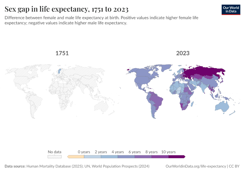 Human Mortality Database (2025); UN, World Population Prospects (2024) – with major processing by Our World in Data. “Life expectancy at birth – HMD – female-male difference, period tables” [dataset]. Human Mortality Database, “Human Mortality Database”; United Nations, “World Population Prospects” [original data]. Retrieved March 12, 2026 from https://wip-stagingserver-resources.owid.pages.dev:8789/20260304-094028/grapher/difference-in-female-and-male-life-expectancy-at-birth.html (archived on March 4, 2026).