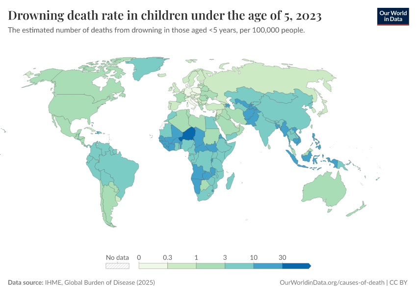 IHME, Global Burden of Disease (2025) – with major processing by Our World in Data. “Drowning death rate in children under the age of 5” [dataset]. IHME, Global Burden of Disease, “Global Burden of Disease - Deaths” [original data]. Retrieved March 12, 2026 from https://wip-stagingserver-resources.owid.pages.dev:8789/20260304-094028/grapher/drowning-death-rates-under-5.html (archived on March 4, 2026).