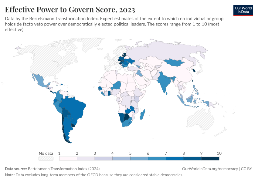 “Data Page: Effective Power to Govern Score”, part of the following publication: Bastian Herre, Lucas Rodés-Guirao, and Esteban Ortiz-Ospina (2013) - “Democracy”. Data adapted from Bertelsmann Transformation Index. Retrieved from https://wip-stagingserver-resources.owid.pages.dev:8789/20260304-094028/grapher/effective-power-to-govern-score-bti.html [online resource] (archived on March 4, 2026).How to cite this data