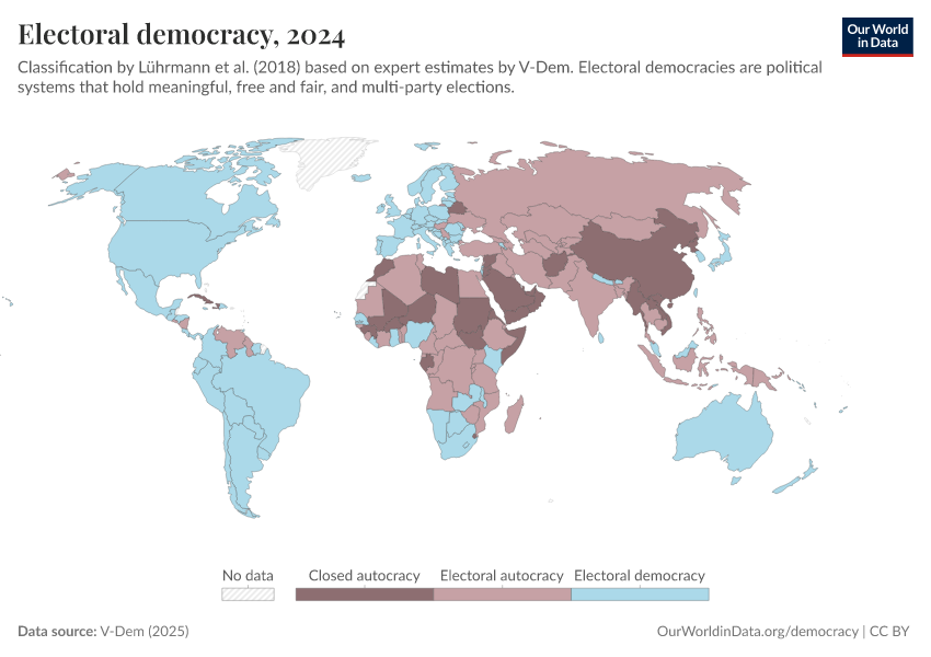 V-Dem (2025) – processed by Our World in Data. “Political regime – reduced” [dataset]. V-Dem, “Democracy report v15” [original data]. Retrieved March 12, 2026 from https://wip-stagingserver-resources.owid.pages.dev:8789/20260304-094028/grapher/electoral-democracy-row.html (archived on March 4, 2026).