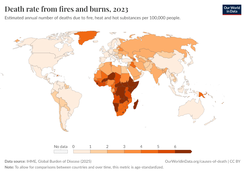 IHME, Global Burden of Disease (2025) – with major processing by Our World in Data. “Death rate from fires and burns” [dataset]. IHME, Global Burden of Disease, “Global Burden of Disease - Deaths” [original data]. Retrieved March 12, 2026 from https://wip-stagingserver-resources.owid.pages.dev:8789/20260304-094028/grapher/fire-death-rates.html (archived on March 4, 2026).