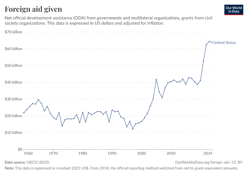 OECD (2025) – with major processing by Our World in Data. “Foreign aid given – Net disbursements” [dataset]. OECD, “OECD Official Development Assistance (ODA) - DAC1: Flows by provider (ODA+OOF+Private)”; OECD, “OECD Official Development Assistance (ODA) - DAC2A: Aid (ODA) disbursements to countries and regions” [original data]. Retrieved March 12, 2026 from https://wip-stagingserver-resources.owid.pages.dev:8789/20260304-094028/grapher/foreign-aid-given-net.html (archived on March 4, 2026).