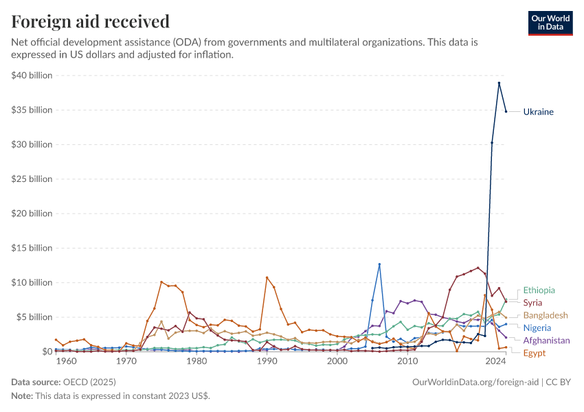 OECD (2025) – with major processing by Our World in Data. “Foreign aid received – Official donors” [dataset]. OECD, “OECD Official Development Assistance (ODA) - DAC2A: Aid (ODA) disbursements to countries and regions” [original data]. Retrieved March 12, 2026 from https://wip-stagingserver-resources.owid.pages.dev:8789/20260304-094028/grapher/foreign-aid-received-net.html (archived on March 4, 2026).