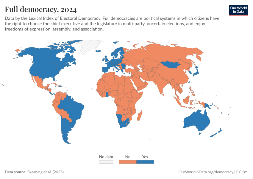 Skaaning et al. (2025) – processed by Our World in Data. “Full democracy” [dataset]. Skaaning et al., “Lexical Index of Electoral Democracy (LIED) v6.8” [original data]. Retrieved March 12, 2026 from https://wip-stagingserver-resources.owid.pages.dev:8789/20260304-094028/grapher/full-democracy-lexical.html (archived on March 4, 2026).