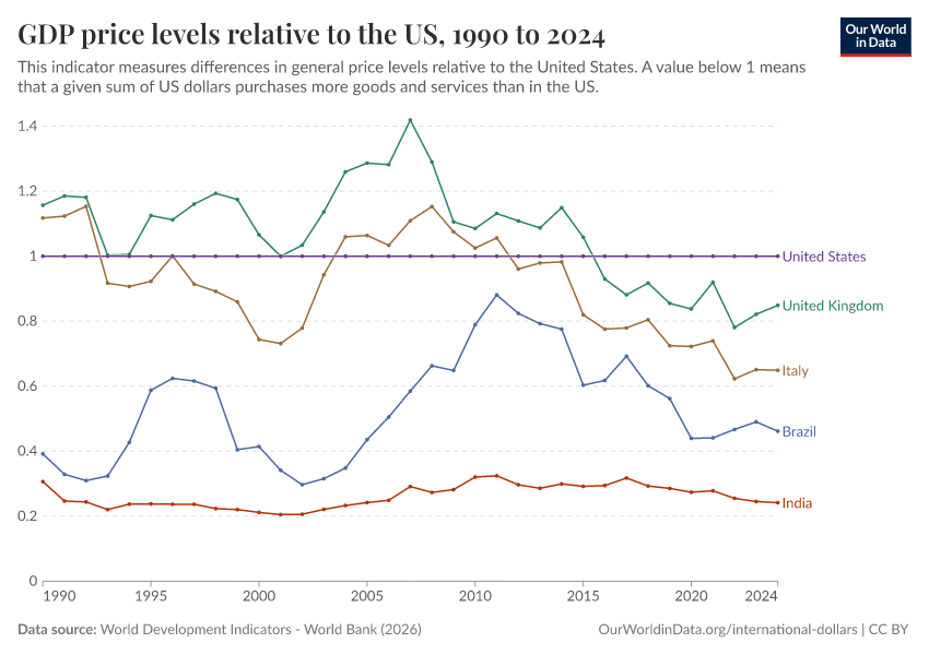 World Development Indicators - World Bank (2026) – processed by Our World in Data. “GDP price levels relative to the US – World Bank” [dataset]. World Development Indicators - World Bank, “World Development Indicators 125” [original data]. Retrieved March 12, 2026 from https://wip-stagingserver-resources.owid.pages.dev:8789/20260304-094028/grapher/gdp-price-levels-relative-to-the-us.html (archived on March 4, 2026).