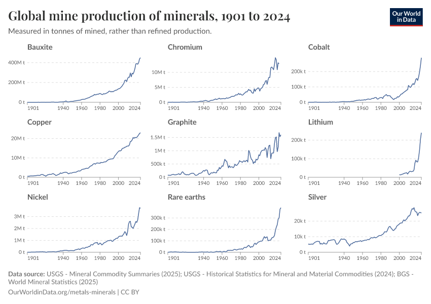 USGS - Mineral Commodity Summaries (2025); USGS - Historical Statistics for Mineral and Material Commodities (2024); BGS - World Mineral Statistics (2025) – with major processing by Our World in Data. “Global mine production of minerals” [dataset]. United States Geological Survey, “Mineral Commodity Summaries”; United States Geological Survey, “Historical Statistics for Mineral and Material Commodities”; British Geological Survey, “World Mineral Statistics” [original data]. Retrieved March 12, 2026 from https://wip-stagingserver-resources.owid.pages.dev:8789/20260304-094028/grapher/global-mine-production-minerals.html (archived on March 4, 2026).