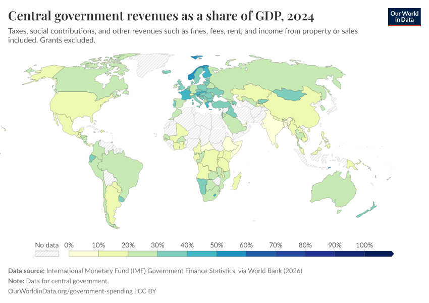“Data Page: Central government revenues as a share of GDP”. Our World in Data (2026). Data adapted from International Monetary Fund (IMF) Government Finance Statistics, via World Bank. Retrieved from https://wip-stagingserver-resources.owid.pages.dev:8789/20260304-094028/grapher/government-revenues-as-a-share-of-gdp-world-bank.html [online resource] (archived on March 4, 2026).How to cite this data