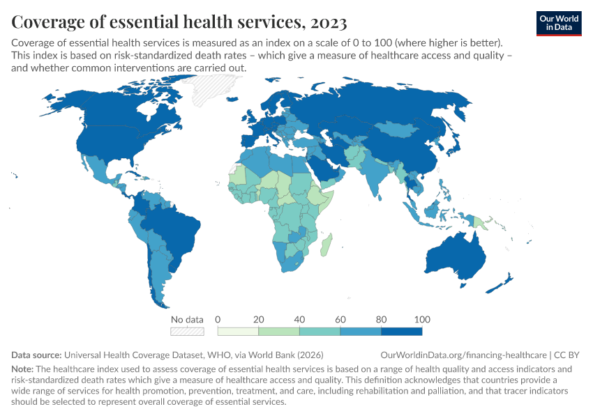 “Data Page: Coverage of essential health services”. Our World in Data (2026). Data adapted from Universal Health Coverage Dataset, WHO, via World Bank. Retrieved from https://wip-stagingserver-resources.owid.pages.dev:8789/20260304-094028/grapher/healthcare-access-quality-un.html [online resource] (archived on March 4, 2026).How to cite this data