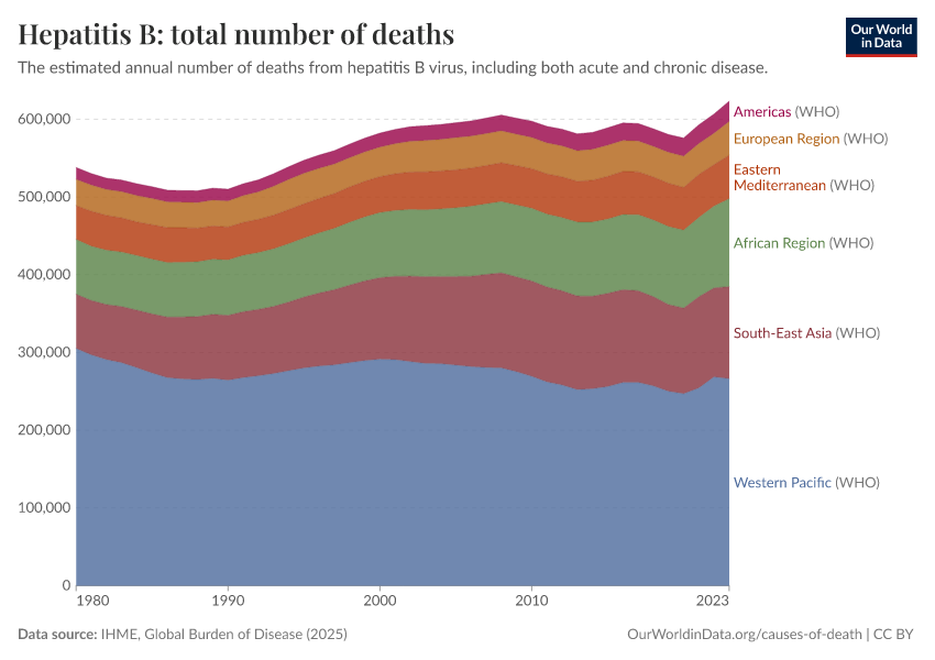 IHME, Global Burden of Disease (2025) – with major processing by Our World in Data. “Hepatitis B: total number of deaths” [dataset]. IHME, Global Burden of Disease, “Global Burden of Disease - Deaths” [original data]. Retrieved March 12, 2026 from https://wip-stagingserver-resources.owid.pages.dev:8789/20260304-094028/grapher/hepatitis-b-number-of-deaths.html (archived on March 4, 2026).