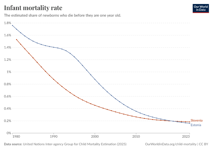 United Nations Inter-agency Group for Child Mortality Estimation (2025) – with minor processing by Our World in Data. “Infant mortality rate” [dataset]. United Nations Inter-agency Group for Child Mortality Estimation, “United Nations Inter-agency Group for Child Mortality Estimation”; Various sources, “Population” [original data]. Retrieved March 12, 2026 from https://wip-stagingserver-resources.owid.pages.dev:8789/20260304-094028/grapher/infant-mortality.html (archived on March 4, 2026).