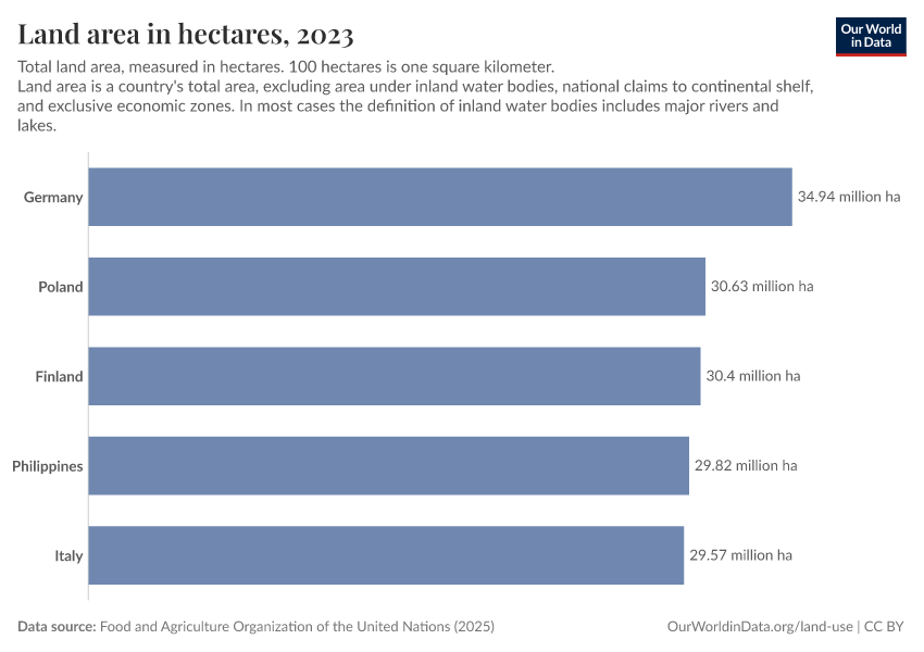 “Data Page: Land area in hectares”, part of the following publication: Hannah Ritchie, Pablo Rosado, and Max Roser (2023) - “Agricultural Production”. Data adapted from Food and Agriculture Organization of the United Nations. Retrieved from https://wip-stagingserver-resources.owid.pages.dev:8789/20260304-094028/grapher/land-area-hectares.html [online resource] (archived on March 4, 2026).
