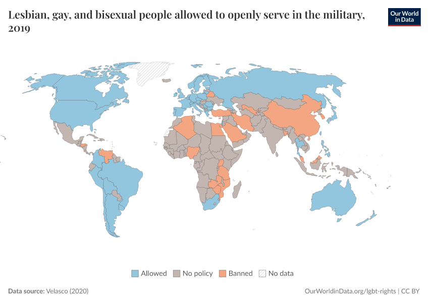 “Data Page: Lesbian, gay, and bisexual people allowed to openly serve in the military”, part of the following publication: Bastian Herre and Pablo Arriagada (2023) - “LGBT+ Rights”. Data adapted from Velasco. Retrieved from https://wip-stagingserver-resources.owid.pages.dev:8789/20260304-094028/grapher/lgb-military-velasco.html [online resource] (archived on March 4, 2026).How to cite this data