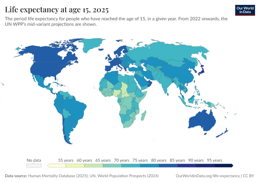 “Data Page: Life expectancy at 15”, part of the following publication: Saloni Dattani, Lucas Rodés-Guirao, Hannah Ritchie, Esteban Ortiz-Ospina, and Max Roser (2023) - “Life Expectancy”. Data adapted from Human Mortality Database, United Nations. Retrieved from https://wip-stagingserver-resources.owid.pages.dev:8789/20260304-094028/grapher/life-expectancy-at-age-15.html [online resource] (archived on March 4, 2026).How to cite this data
