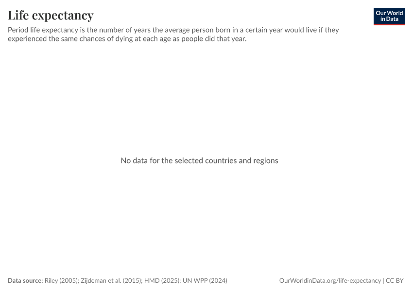 - This chart shows long-run estimates of life expectancy compiled by our team from several data sources. Before 1950, for country-level data, we rely on the Human Mortality Database (2025) combined with Zijdeman (2015). For regional data, we use Riley (2005). From 1950 onward, we use the United Nations World Population Prospects (2024).