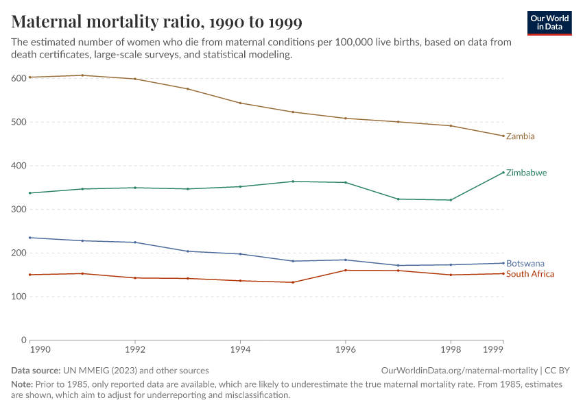 “Data Page: Maternal mortality ratio”, part of the following publication: Max Roser and Hannah Ritchie (2013) - “Maternal Mortality”. Data adapted from UN MMEIG (WHO, UNICEF, UNFPA, World Bank Group and UNDESA/ Population Division), WHO Mortality Database, United Nations, Gapminder. Retrieved from https://wip-stagingserver-resources.owid.pages.dev:8789/20260304-094028/grapher/maternal-mortality.html [online resource] (archived on March 4, 2026).