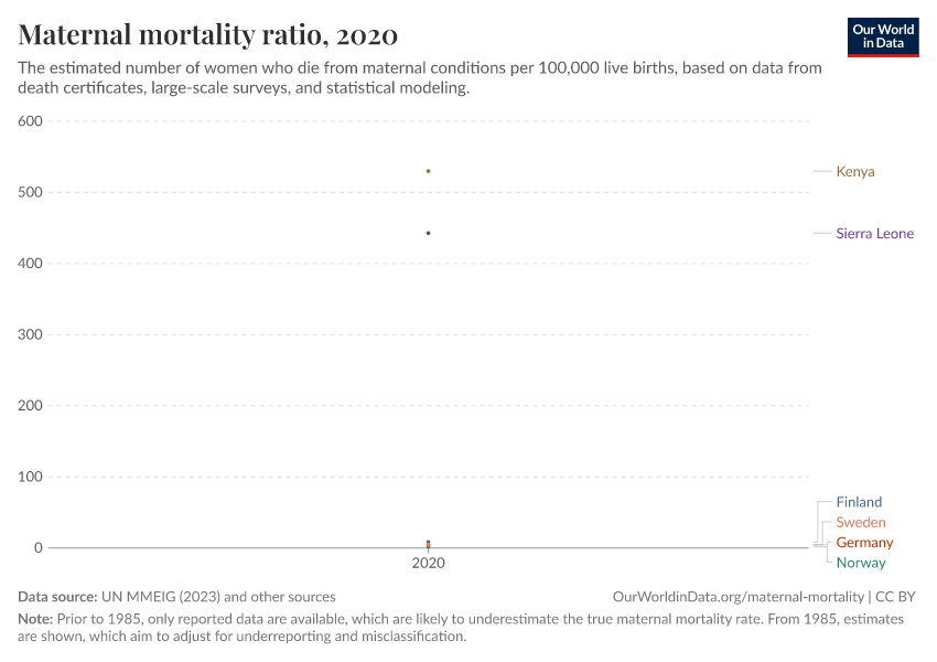 UN MMEIG (2023); WHO Mortality Database (2025); UN, World Population Prospects (2024); Gapminder (2010) – with major processing by Our World in Data. “Maternal mortality ratio” [dataset]. UN MMEIG (WHO, UNICEF, UNFPA, World Bank Group and UNDESA/ Population Division), “Trends in maternal mortality 2020”; WHO Mortality Database, “WHO Mortality Database”; United Nations, “World Population Prospects”; Gapminder, “Maternal mortality ratio V1” [original data]. Retrieved March 12, 2026 from https://wip-stagingserver-resources.owid.pages.dev:8789/20260304-094028/grapher/maternal-mortality.html (archived on March 4, 2026).