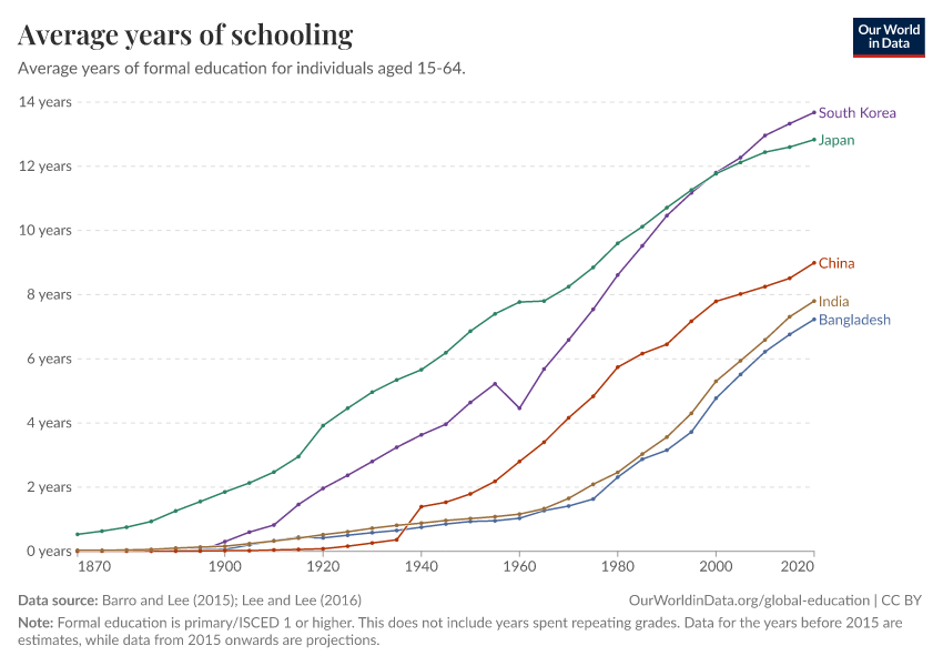 Barro and Lee (2015); Lee and Lee (2016) – with major processing by Our World in Data. “Average years of schooling” [dataset]. Barro and Lee, “Projections of Educational Attainment”; Lee and Lee, “Human Capital in the Long Run” [original data]. Retrieved March 12, 2026 from https://wip-stagingserver-resources.owid.pages.dev:8789/20260304-094028/grapher/mean-years-of-schooling-long-run.html (archived on March 4, 2026).