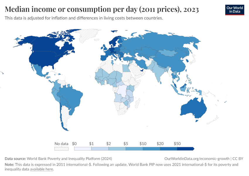 World Bank Poverty and Inequality Platform (2024) – with major processing by Our World in Data. “Median income or consumption per day (2011 prices) – World Bank” [dataset]. World Bank Poverty and Inequality Platform, “World Bank Poverty and Inequality Platform (PIP) 20240627_2017, 20240627_2011” [original data]. Retrieved March 12, 2026 from https://wip-stagingserver-resources.owid.pages.dev:8789/20260304-094028/grapher/median-income-or-consumption-per-day-2011-prices.html (archived on March 4, 2026).