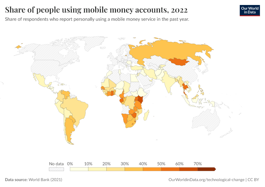 “Data Page: Share of people using mobile money accounts”, part of the following publication: Max Roser, Bertha Rohenkohl, Pablo Arriagada, Joe Hasell, Hannah Ritchie, and Esteban Ortiz-Ospina (2023) - “Economic Growth”. Data adapted from World Bank. Retrieved from https://wip-stagingserver-resources.owid.pages.dev:8789/20260304-094028/grapher/mobile-money-account-usage.html [online resource] (archived on March 4, 2026).How to cite this data