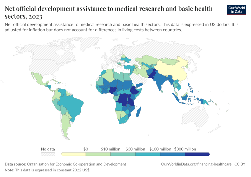 “Data Page: Net official development assistance to medical research and basic health sectors”. Our World in Data (2026). Data adapted from Organisation for Economic Co-operation and Development. Retrieved from https://wip-stagingserver-resources.owid.pages.dev:8789/20260304-094028/grapher/net-oda-to-medical-research.html [online resource] (archived on March 4, 2026).How to cite this data