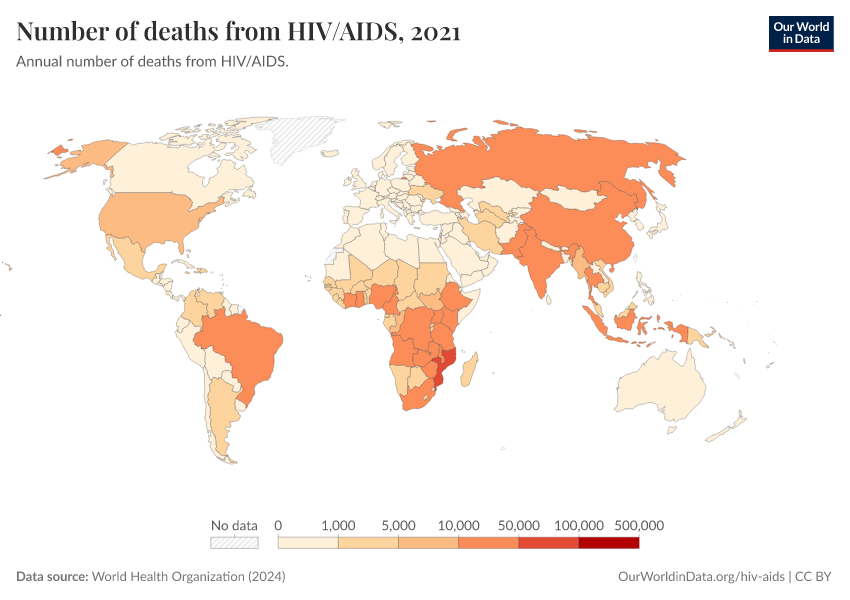 World Health Organization (2024) – with major processing by Our World in Data. “Number of deaths from HIV/AIDS” [dataset]. World Health Organization, “Global Health Estimates” [original data]. Retrieved March 12, 2026 from https://wip-stagingserver-resources.owid.pages.dev:8789/20260304-094028/grapher/number-of-deaths-from-hivaids-who.html (archived on March 4, 2026).