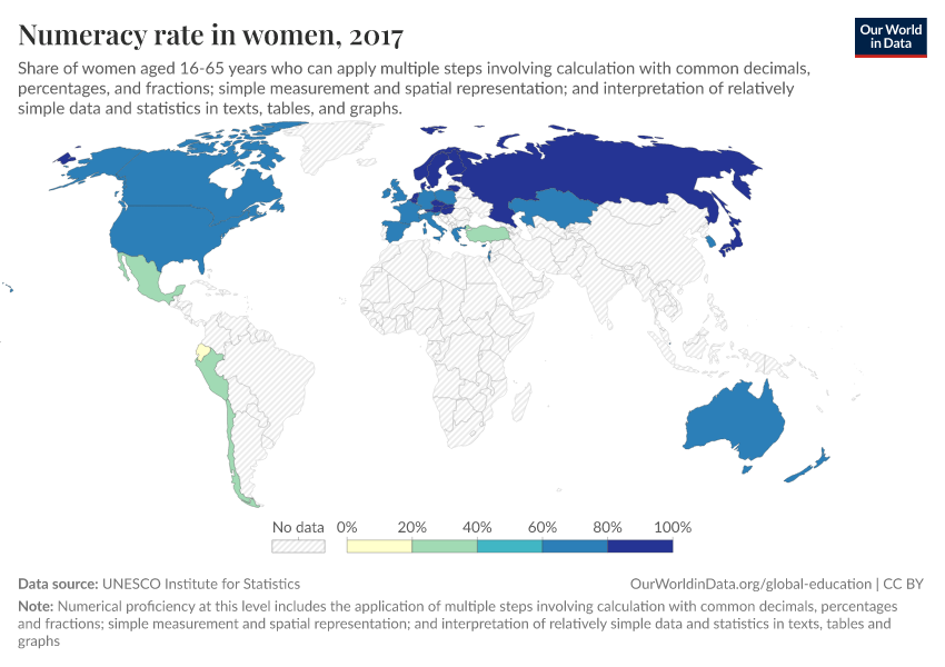 “Data Page: Numeracy rate in women”. Our World in Data (2026). Data adapted from UNESCO Institute for Statistics. Retrieved from https://wip-stagingserver-resources.owid.pages.dev:8789/20260304-094028/grapher/numeracy-rate-in-adult-women-sdg.html [online resource] (archived on March 4, 2026).How to cite this data