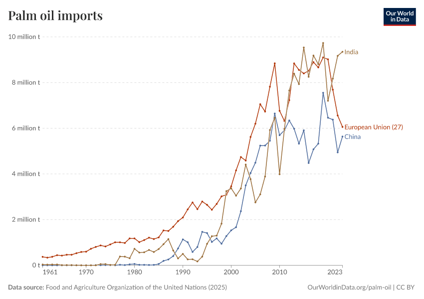 “Data Page: Imports of palm oil”. Our World in Data (2026). Data adapted from Food and Agriculture Organization of the United Nations. Retrieved from https://wip-stagingserver-resources.owid.pages.dev:8789/20260304-094028/grapher/palm-oil-imports.html [online resource] (archived on March 4, 2026).