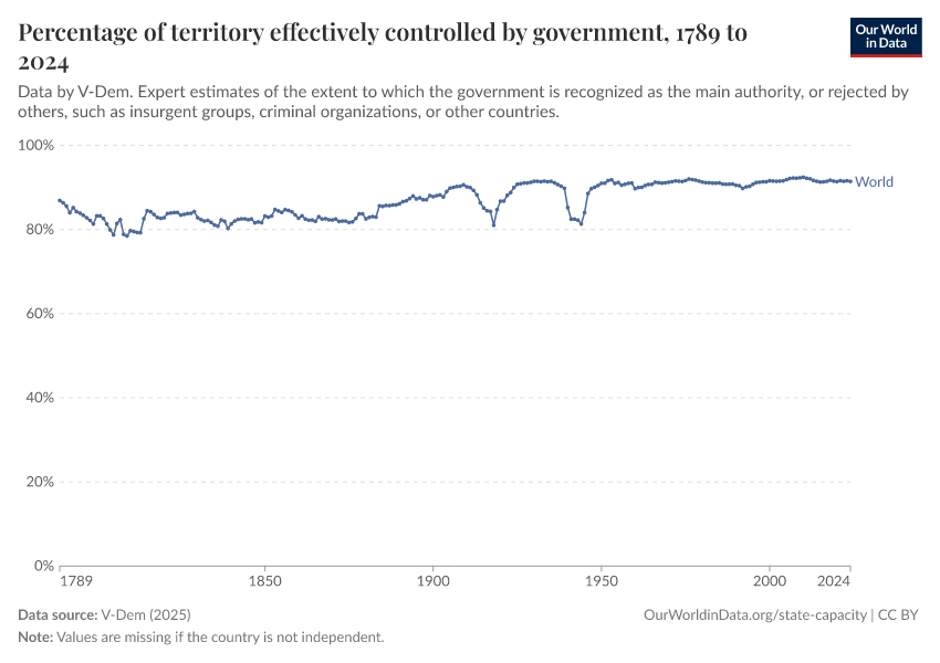 “Data Page: Territory under state control”, part of the following publication: Bastian Herre, Lucas Rodés-Guirao, and Esteban Ortiz-Ospina (2013) - “Democracy”. Data adapted from V-Dem. Retrieved from https://wip-stagingserver-resources.owid.pages.dev:8789/20260304-094028/grapher/percentage-of-territory-controlled-by-government.html [online resource] (archived on March 4, 2026).How to cite this data