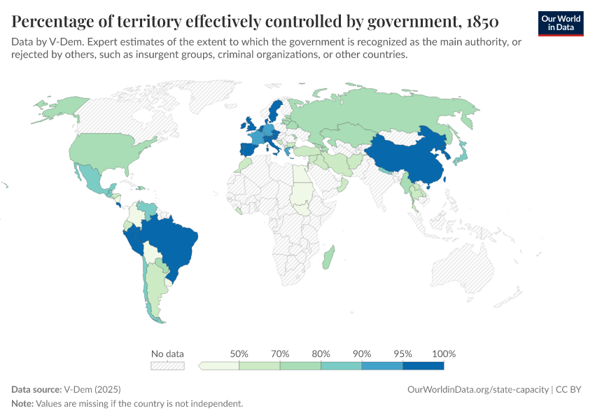 “Data Page: Territory under state control”, part of the following publication: Bastian Herre, Lucas Rodés-Guirao, and Esteban Ortiz-Ospina (2013) - “Democracy”. Data adapted from V-Dem. Retrieved from https://wip-stagingserver-resources.owid.pages.dev:8789/20260304-094028/grapher/percentage-of-territory-controlled-by-government.html [online resource] (archived on March 4, 2026).