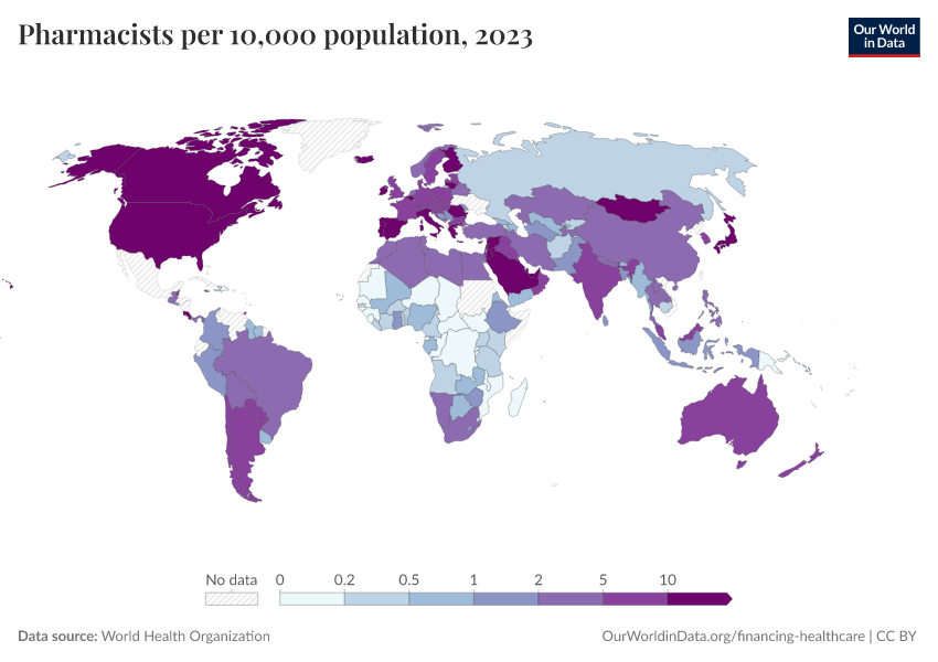 “Data Page: Pharmacists per 10,000 population”. Our World in Data (2026). Data adapted from World Health Organization. Retrieved from https://wip-stagingserver-resources.owid.pages.dev:8789/20260304-094028/grapher/pharmaceutical-personnel-per-1000.html [online resource] (archived on March 4, 2026).How to cite this data
