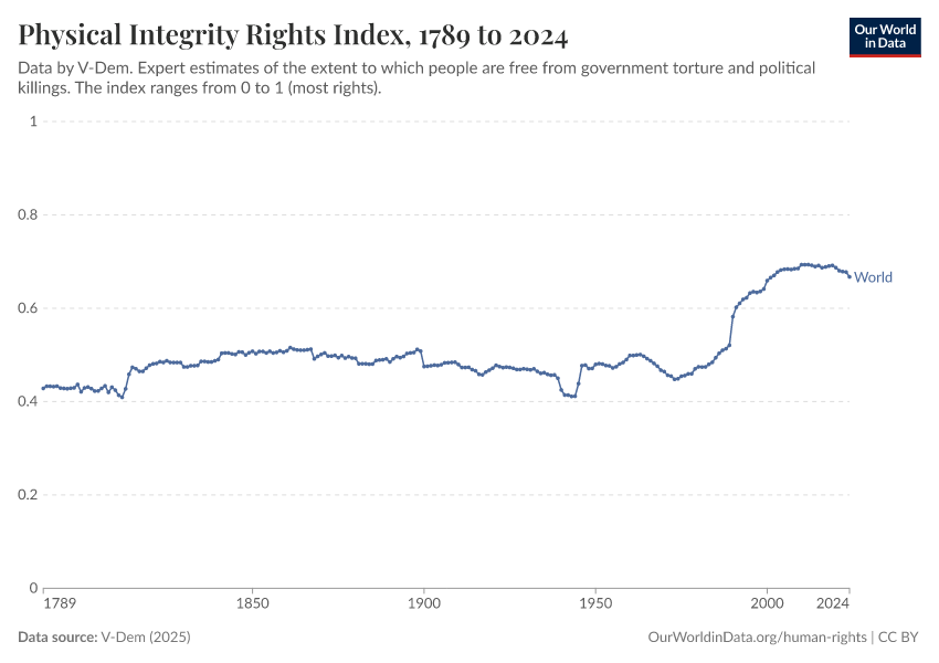 V-Dem (2025) – processed by Our World in Data. “Physical violence index – V-Dem” [dataset]. V-Dem, “Democracy report v15” [original data]. Retrieved March 12, 2026 from https://wip-stagingserver-resources.owid.pages.dev:8789/20260304-094028/grapher/physical-integrity-rights-index-vdem.html (archived on March 4, 2026).