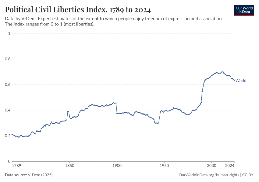 V-Dem (2025) – processed by Our World in Data. “Political civil liberties index – V-Dem” [dataset]. V-Dem, “Democracy report v15” [original data]. Retrieved March 12, 2026 from https://wip-stagingserver-resources.owid.pages.dev:8789/20260304-094028/grapher/political-civil-liberties-index.html (archived on March 4, 2026).