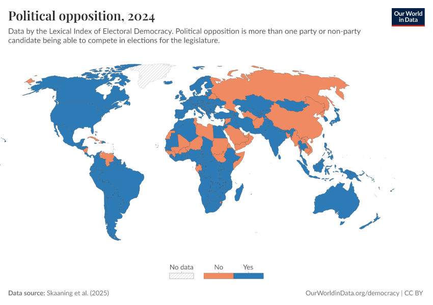 Skaaning et al. (2025) – processed by Our World in Data. “Political opposition” [dataset]. Skaaning et al., “Lexical Index of Electoral Democracy (LIED) v6.8” [original data]. Retrieved March 12, 2026 from https://wip-stagingserver-resources.owid.pages.dev:8789/20260304-094028/grapher/political-opposition-lexical.html (archived on March 4, 2026).