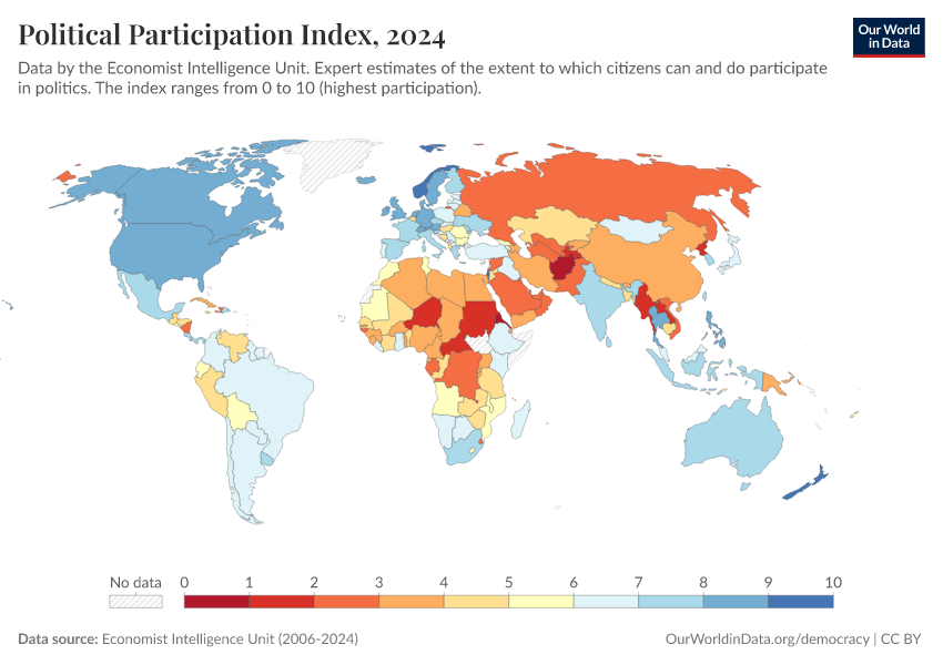 Economist Intelligence Unit (2006-2024) – processed by Our World in Data. “Political Participation Index” [dataset]. Economist Intelligence Unit, “Democracy Index 2021: The China challenge”; Economist Intelligence Unit, “Democracy Index 2022: Frontline democracy and the battle for Ukraine”; Economist Intelligence Unit, “Democracy Index 2023: Age of Conflict”; Economist Intelligence Unit, “Democracy Index 2024: What's wrong with representative democracy?”; Gapminder, “Democracy Index v4”; Various sources, “Population” [original data]. Retrieved March 12, 2026 from https://wip-stagingserver-resources.owid.pages.dev:8789/20260304-094028/grapher/political-participation-index-eiu.html (archived on March 4, 2026).