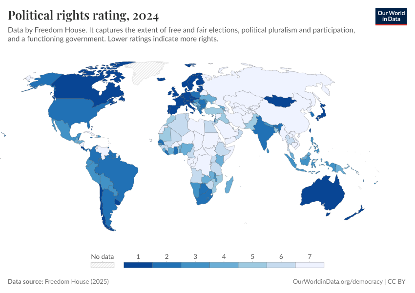 Freedom House (2025) – processed by Our World in Data. “Political rights rating” [dataset]. Freedom House, “Freedom in the World” [original data]. Retrieved March 12, 2026 from https://wip-stagingserver-resources.owid.pages.dev:8789/20260304-094028/grapher/political-rights-rating-fh.html (archived on March 4, 2026).