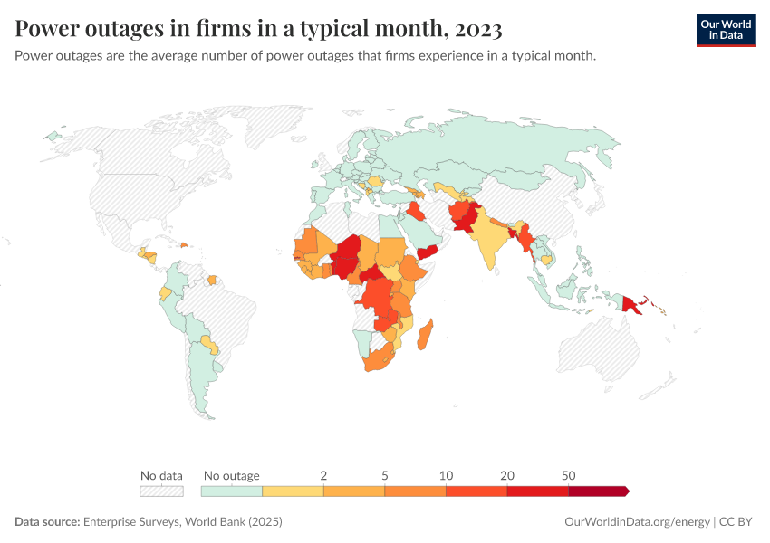 “Data Page: Power outages in firms in a typical month”. Our World in Data (2026). Data adapted from Enterprise Surveys, World Bank. Retrieved from https://wip-stagingserver-resources.owid.pages.dev:8789/20260304-094028/grapher/power-outages-in-firms-per-month.html [online resource] (archived on March 4, 2026).