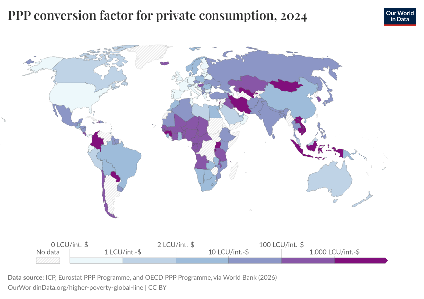 “Data Page: PPP conversion factor for private consumption”. Our World in Data (2026). Data adapted from ICP, Eurostat PPP Programme, and OECD PPP Programme, via World Bank. Retrieved from https://wip-stagingserver-resources.owid.pages.dev:8789/20260304-094028/grapher/ppp-conversion-factor-for-private-consumption.html [online resource] (archived on March 4, 2026).How to cite this data