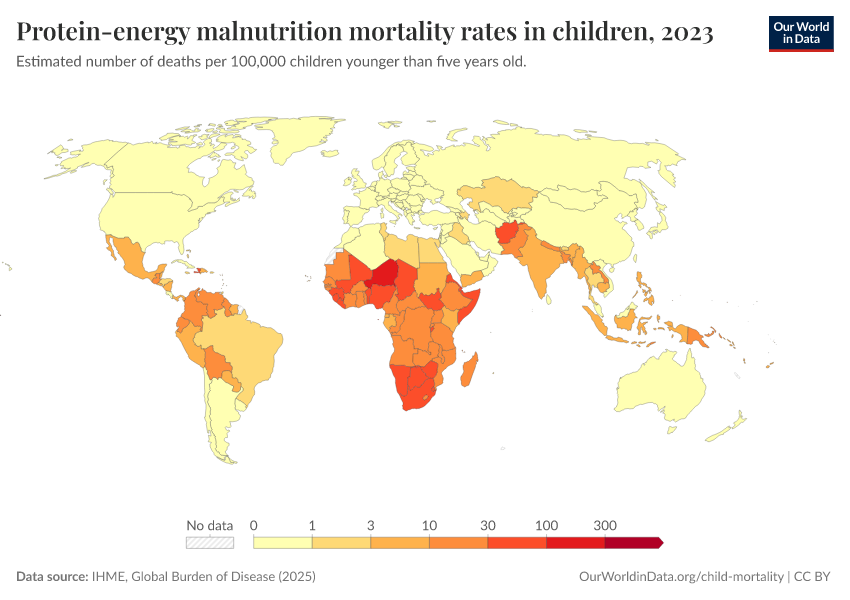 IHME, Global Burden of Disease (2025) – with major processing by Our World in Data. “Protein-energy malnutrition mortality rates in children ” [dataset]. IHME, Global Burden of Disease, “Global Burden of Disease - Deaths” [original data]. Retrieved March 12, 2026 from https://wip-stagingserver-resources.owid.pages.dev:8789/20260304-094028/grapher/protein-energy-malnutrition-mortality-rates-in-children.html (archived on March 4, 2026).