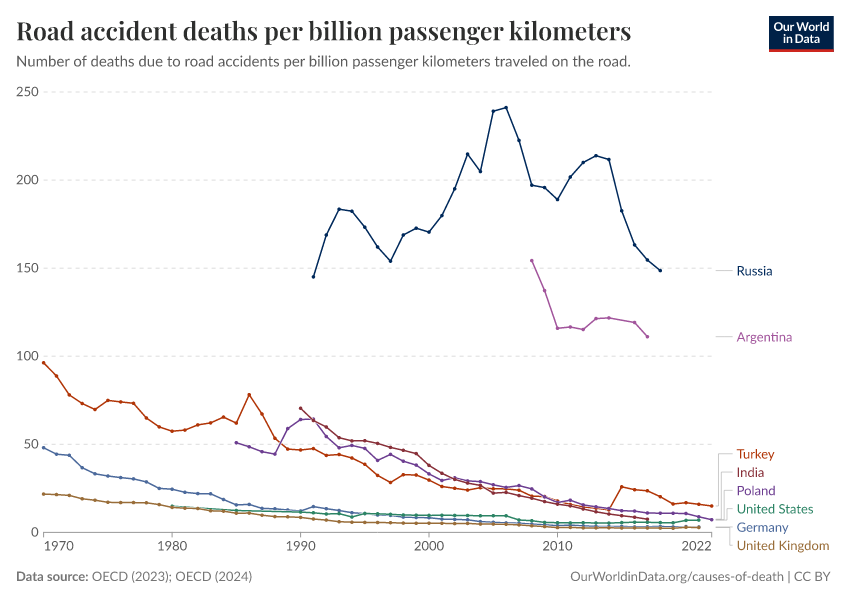 “Data Page: Road accident deaths per billion passenger kilometers”, part of the following publication: Hannah Ritchie and Max Roser (2021) - “Transport”. Data adapted from OECD. Retrieved from https://wip-stagingserver-resources.owid.pages.dev:8789/20260304-094028/grapher/road-accident-deaths-per-passenger-kilometers.html [online resource] (archived on March 4, 2026).How to cite this data