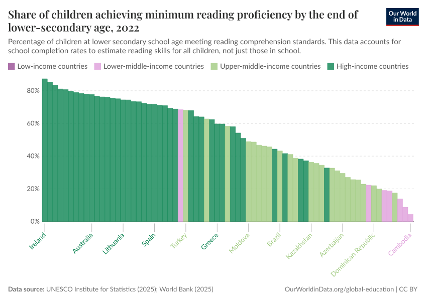“Data Page: Share of children achieving minimum reading proficiency by the end of lower secondary age”, part of the following publication: Hannah Ritchie, Veronika Samborska, Esteban Ortiz-Ospina, and Max Roser (2023) - “Global Education”. Data adapted from UNESCO Institute for Statistics. Retrieved from https://wip-stagingserver-resources.owid.pages.dev:8789/20260304-094028/grapher/share-of-children-reaching-sufficient-reading-comprehension-by-the-end-of-lower-secondary-age.html [online resource] (archived on March 4, 2026).How to cite this data