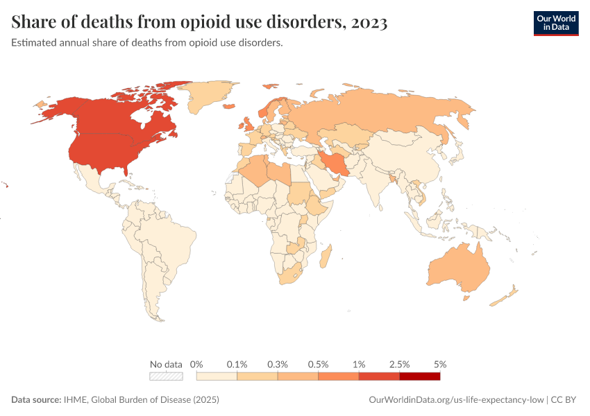 IHME, Global Burden of Disease (2025) – with major processing by Our World in Data. “Share of deaths from opioid use disorders” [dataset]. IHME, Global Burden of Disease, “Global Burden of Disease - Deaths” [original data]. Retrieved March 12, 2026 from https://wip-stagingserver-resources.owid.pages.dev:8789/20260304-094028/grapher/share-of-deaths-from-opioid-overdoses.html (archived on March 4, 2026).