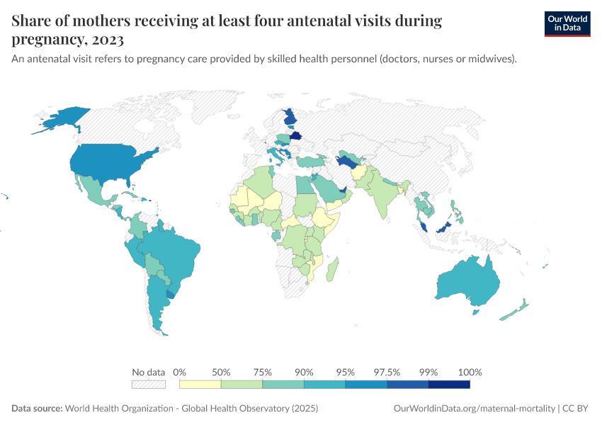 “Data Page: Share of mothers receiving at least four antenatal visits during pregnancy”. Our World in Data (2026). Data adapted from World Health Organization. Retrieved from https://wip-stagingserver-resources.owid.pages.dev:8789/20260304-094028/grapher/share-of-mothers-receiving-at-least-four-antenatal-visits-during-pregnancy.html [online resource] (archived on March 4, 2026).How to cite this data