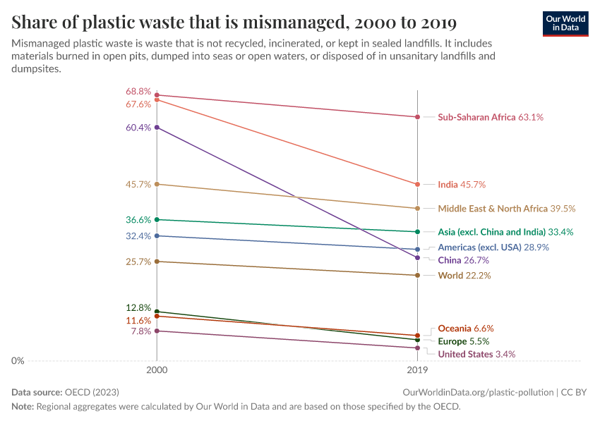 OECD (2023) – processed by Our World in Data. “Share of plastic waste that is mismanaged” [dataset]. OECD, “Global Plastics Outlook - Plastics waste by region and end-of-life fate” [original data]. Retrieved March 12, 2026 from https://wip-stagingserver-resources.owid.pages.dev:8789/20260304-094028/grapher/share-of-plastic-waste-that-is-mismanaged.html (archived on March 4, 2026).