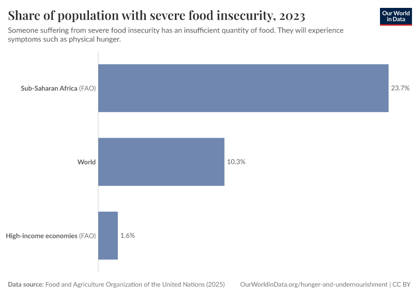 Food and Agriculture Organization of the United Nations (2025) – with major processing by Our World in Data. “Prevalence of severe food insecurity in the total population – UN FAO – 3-year average” [dataset]. Food and Agriculture Organization of the United Nations, “Food Security and Nutrition: Suite of Food Security Indicators” [original data]. Retrieved March 12, 2026 from https://wip-stagingserver-resources.owid.pages.dev:8789/20260304-094028/grapher/share-of-population-with-severe-food-insecurity.html (archived on March 4, 2026).