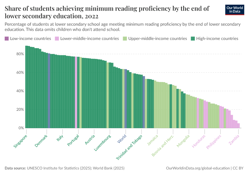 “Data Page: Share of students achieving minimum reading proficiency by the end of lower secondary education”, part of the following publication: Hannah Ritchie, Veronika Samborska, Esteban Ortiz-Ospina, and Max Roser (2023) - “Global Education”. Data adapted from UNESCO Institute for Statistics. Retrieved from https://wip-stagingserver-resources.owid.pages.dev:8789/20260304-094028/grapher/share-of-students-at-end-of-lower-secondary-education-with-minimum-reading-proficiency.html [online resource] (archived on March 4, 2026).How to cite this data