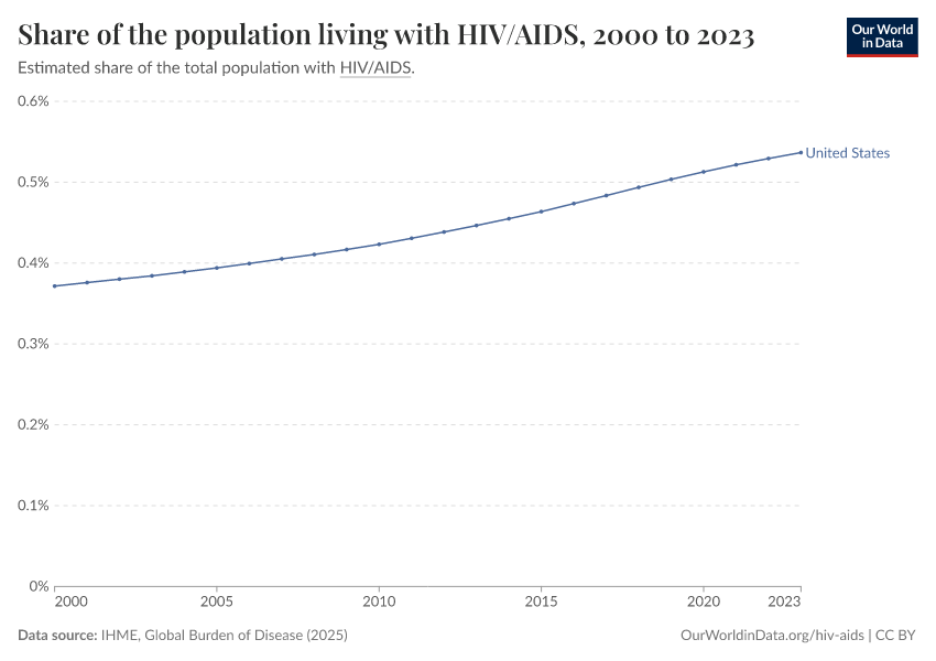 IHME, Global Burden of Disease (2025) – with major processing by Our World in Data. “Share of the population living with HIV/AIDS” [dataset]. IHME, Global Burden of Disease, “Global Burden of Disease - Prevalence and Incidence” [original data]. Retrieved March 12, 2026 from https://wip-stagingserver-resources.owid.pages.dev:8789/20260304-094028/grapher/share-of-the-population-living-with-hivaids.html (archived on March 4, 2026).