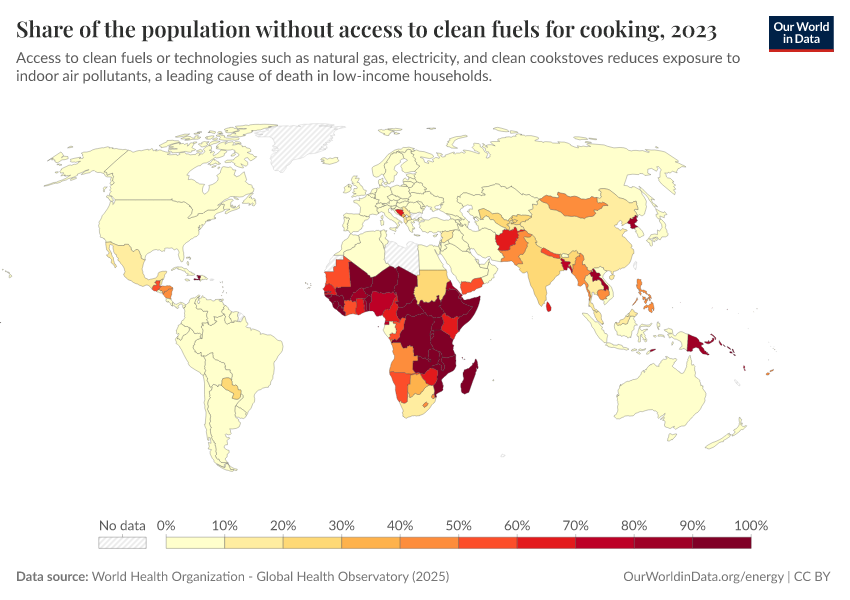 World Health Organization - Global Health Observatory (2025) – processed by Our World in Data. “Share of the population without access to clean fuels for cooking” [dataset]. World Health Organization, “Global Health Observatory” [original data]. Retrieved March 12, 2026 from https://wip-stagingserver-resources.owid.pages.dev:8789/20260304-094028/grapher/share-of-the-population-without-access-to-clean-fuels-for-cooking.html (archived on March 4, 2026).