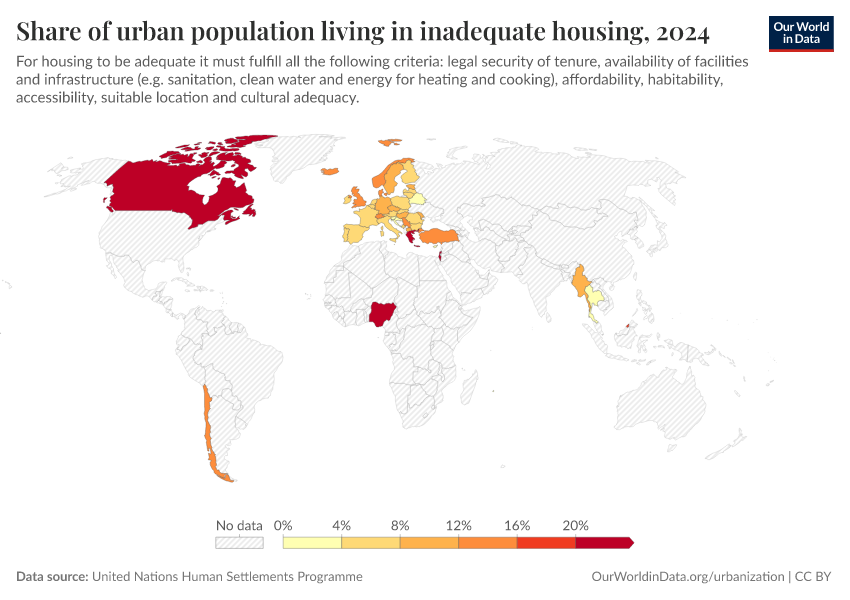 “Data Page: Share of urban population living in inadequate housing”. Our World in Data (2026). Data adapted from United Nations Human Settlements Programme. Retrieved from https://wip-stagingserver-resources.owid.pages.dev:8789/20260304-094028/grapher/share-of-urban-population-living-in-inadequate-housing.html [online resource] (archived on March 4, 2026).How to cite this data