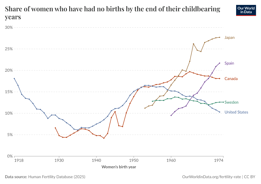 Human Fertility Database (2025) – processed by Our World in Data. “Share of women who have had no births by the end of their childbearing years – HFD” [dataset]. Human Fertility Database, “Human Fertility Database” [original data]. Retrieved March 12, 2026 from https://wip-stagingserver-resources.owid.pages.dev:8789/20260304-094028/grapher/share-of-women-who-have-had-no-births-across-their-childbearing-years.html (archived on March 4, 2026).