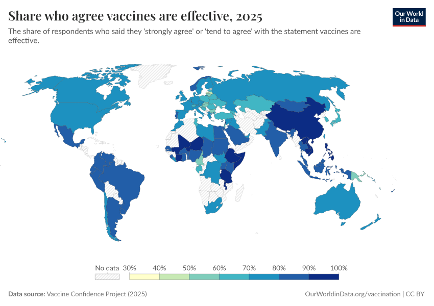 Vaccine Confidence Project (2025) – processed by Our World in Data. “Share who agree vaccines are effective” [dataset]. Vaccine Confidence Project, “Vaccine Confidence Index” [original data]. Retrieved March 12, 2026 from https://wip-stagingserver-resources.owid.pages.dev:8789/20260304-094028/grapher/share-who-agree-vaccines-are-effective.html (archived on March 4, 2026).